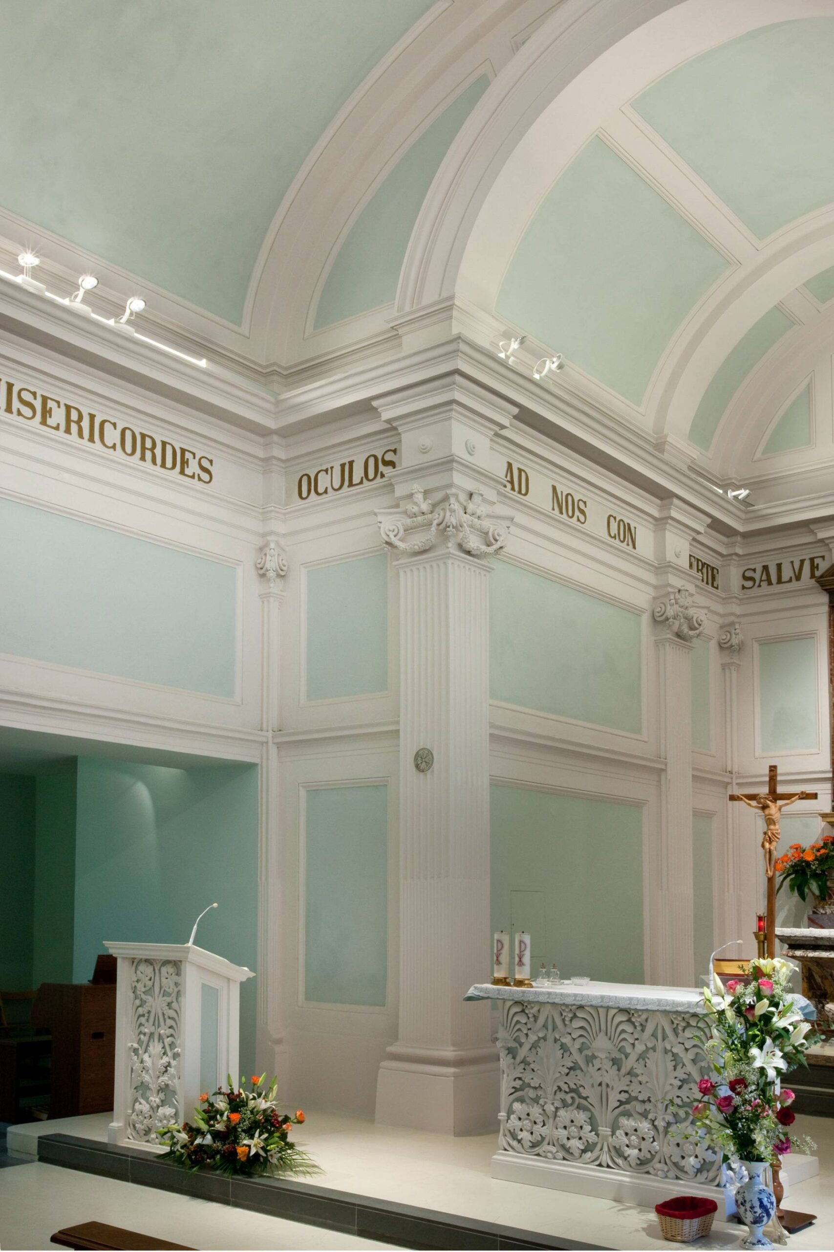 L’intervento di restauro ha coinvolto tutte le componenti dell’edificio religioso da quelle impiantistiche, come ad esempio l’illuminazione, a quelle strutturali- architettoniche della copertura, delle pavimentazione interne e d esterne, degli infissi, della nuova bussola all’ingresso, delle finiture interne ed esterne, del restauro degli stucchi e della progettazione e realizzazione dei nuovi elementi liturgici.